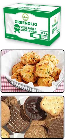 GREENOLIO Vegetable Shortening is a healthy Trans-free palm based specialty fat. It is a premium quality shortening derived from fractionated bleached and deodorized palm oil. It is specially formulat¬ed to ensure good leaving and tendering effect in dough products. GREENOLIO Vegetable Shortening provides good texture and shortening effect for biscuits and cookies. It exhibits remarkable performance in product volume thus making it very cost effective.
